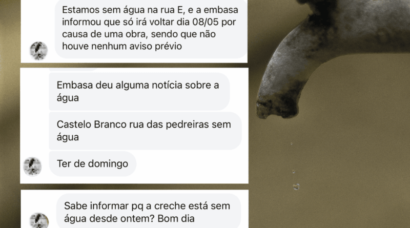 Read MoreMoradores de diferentes etapas do bairro estão nos enviando mensagens relatando a falta de água, como mostram os prints destacados